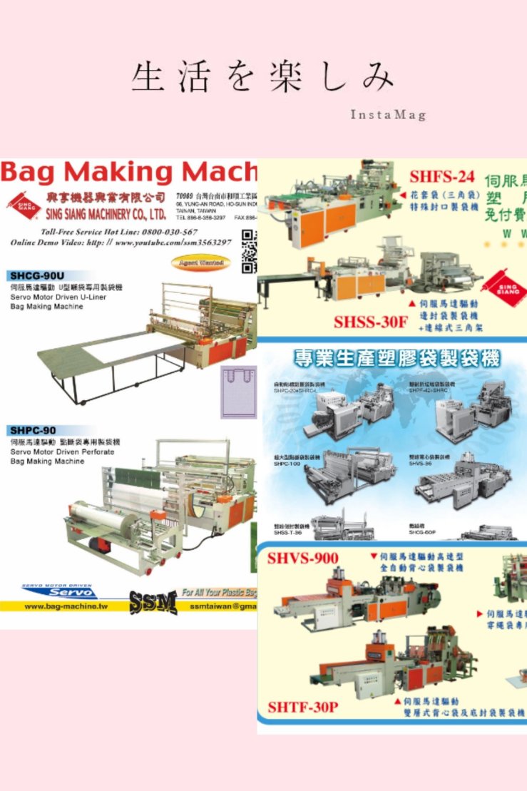 SING SIANG MACHINERY CO., LTD 66, YUNG-AN ROAD, HO-SUN INDUSTRY PARK, TAINAN CITY 70969, TAIWAN TEL: + 886-6-356-3297 FAX: + 886-6-356-7267 TOLL FREE SERVICE LINE : 0800-030-567 www.bag-machine.tw bag886@gmail.com FB: www.facebook.com/bagmachine Youtube: http://www.youtube.com/ssm3563297 IG: https://www.instagram.com/ssm886 Skype : ssm3563297 Line ID : 3563297 Wechat : h0912672257 Whatsapp : +886-912672257 FB Messenger : https://m.me/ssmtwn 興享機器興業有限公司 70969 台南市和順工業區永安路66號 Tel:06-356-3297 Fax:06-356-7267 www.bag-machine.tw bag886@gmail.com 免付費服務專線:0800-030-567 LINE ID : 3563297 檢視 SSM BAG MACHINE 的所有文章